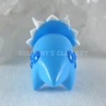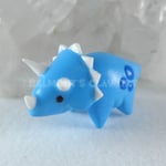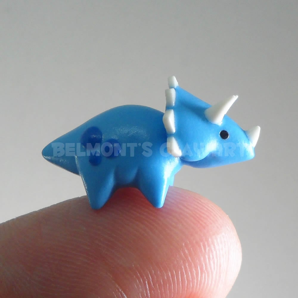 This is a blue mini Triceratops made from polymer clay. These tiny creatures are the perfect decorative items for small figurine shelves or miniature dioramas๐.
