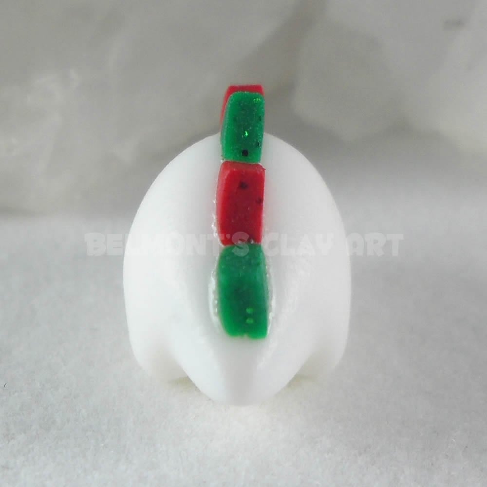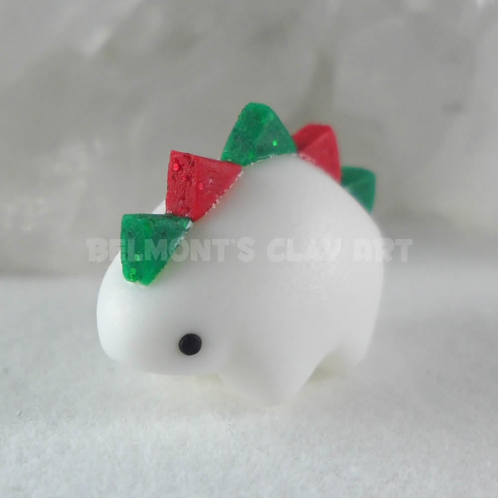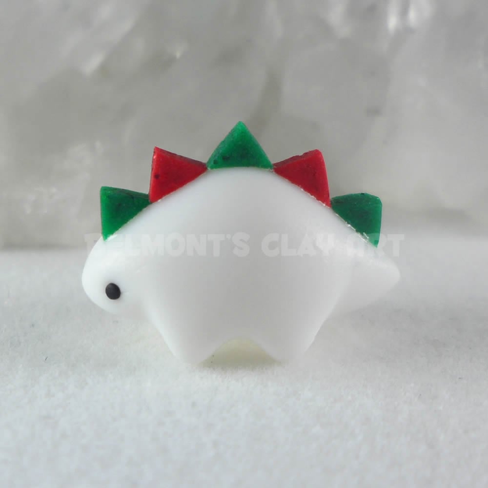 This is a mini Christmas dino made of polymer clay. The small red and green spikes on his back have some glitter mixed in.
