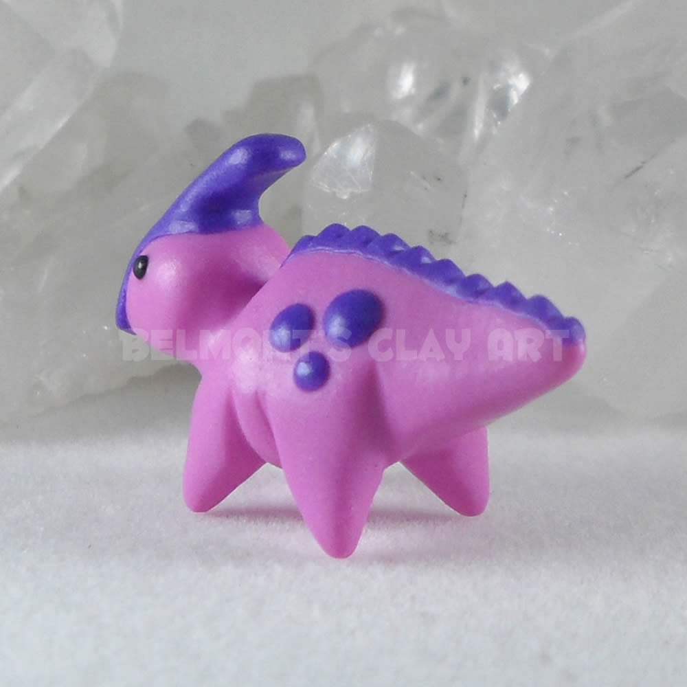 A more detailed handmade mini Parasaurolophus, crafted in soft lavender polymer clay with a bold violet crest, six violet spots, and small back spikes. Slightly larger and more realistic than the kawaii version, this little dino balances detailed sculpting with a fun, colorful look. Finished with a satin varnish to give it a subtle sheenโจ. Please note that as each one is handcrafted, small differences (especially in the crest) may occur, making every dino a one-of-a-kind piece.