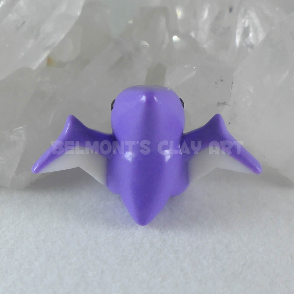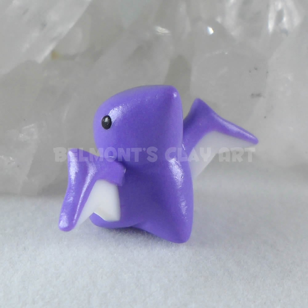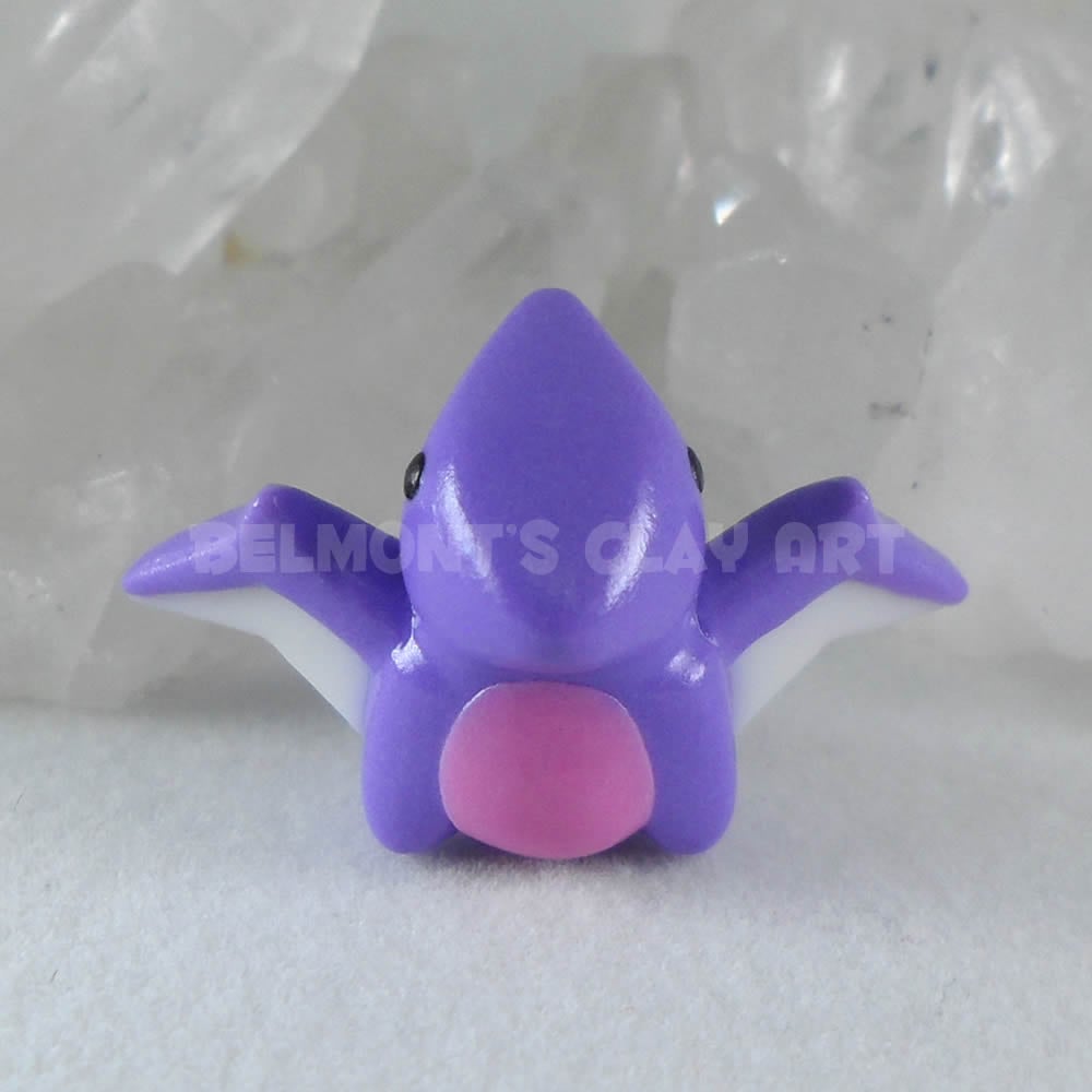 This is a purple kawaii Pteranodon made from polymer clay. These tiny creatures are the perfect decorative items for small figurine shelves or miniature dioramas๐.