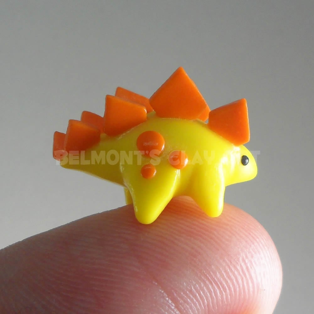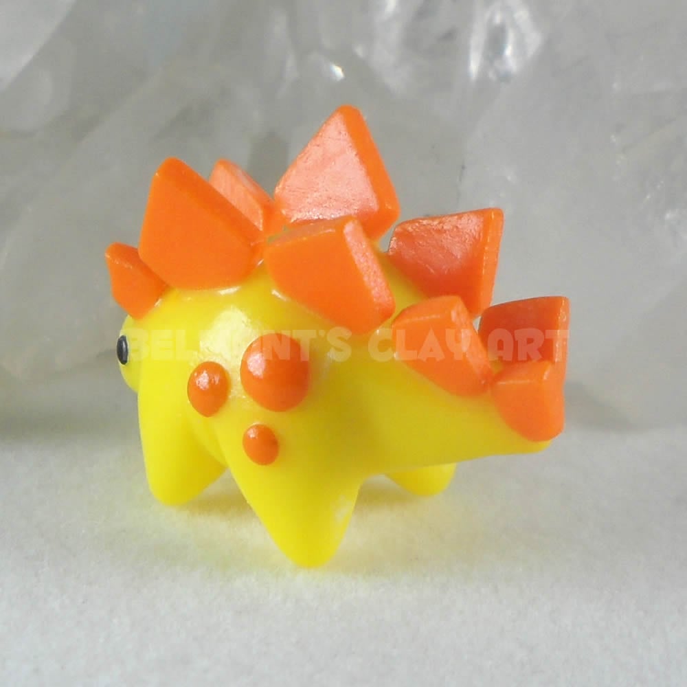 This is a tiny yellow stegosaurus with orange plates on its back made of polymer clay. These tiny creatures are the perfect decorative items for small figurine shelves or miniature dioramas๐.