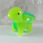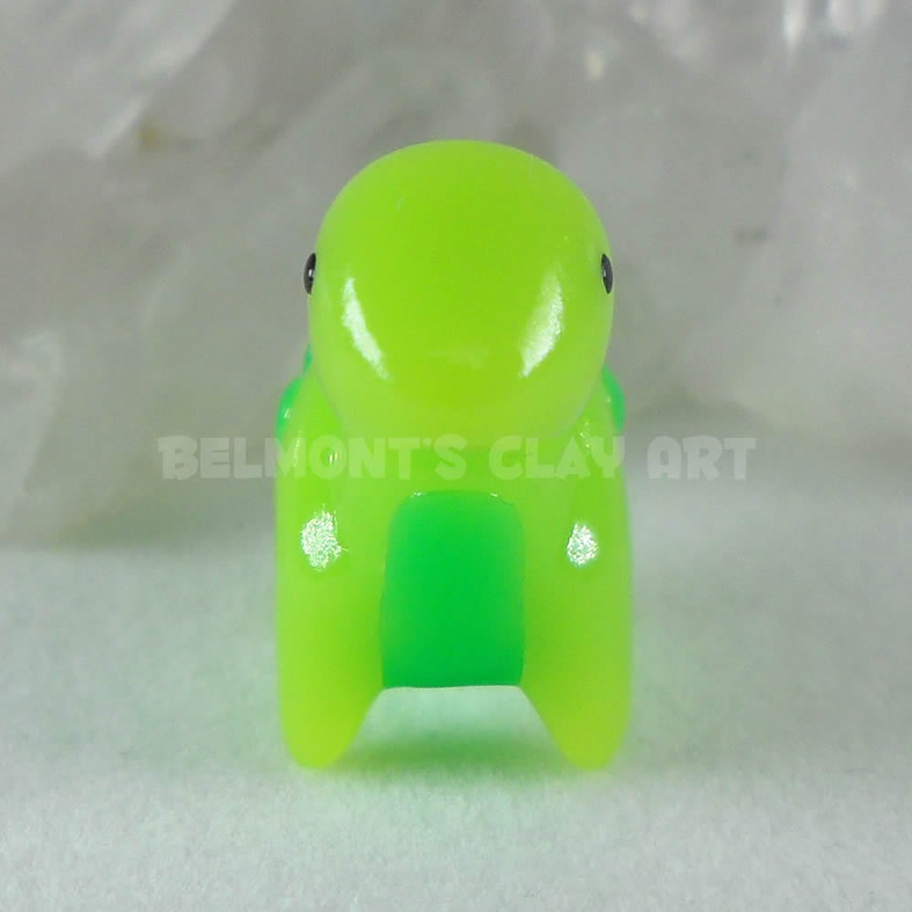 This tiny Diplodocus is handcrafted from light green translucent polymer clay, with six deep green translucent spots, matching little back spikes, and a darker green underside for contrast.