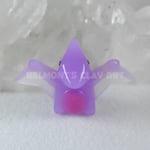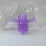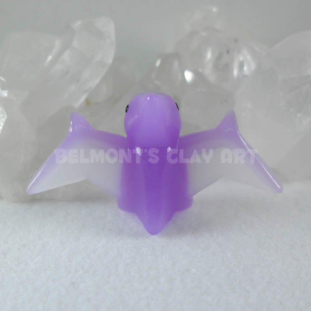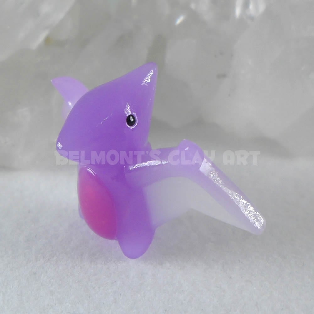 This is a purple pteranodon made of translucent polymer clay. These tiny creatures are the perfect decorative items for small figurine shelves or miniature dioramas👌.