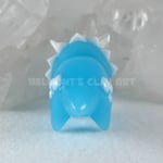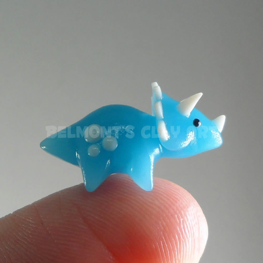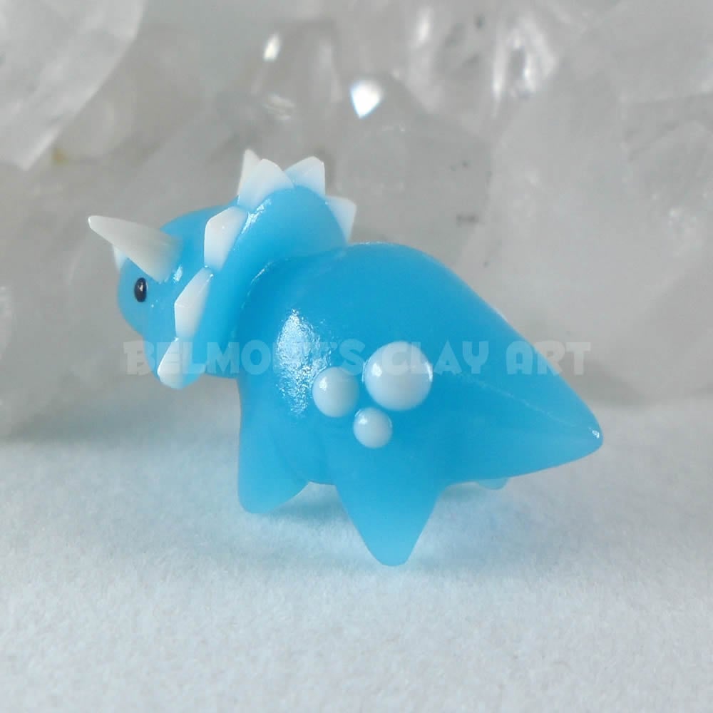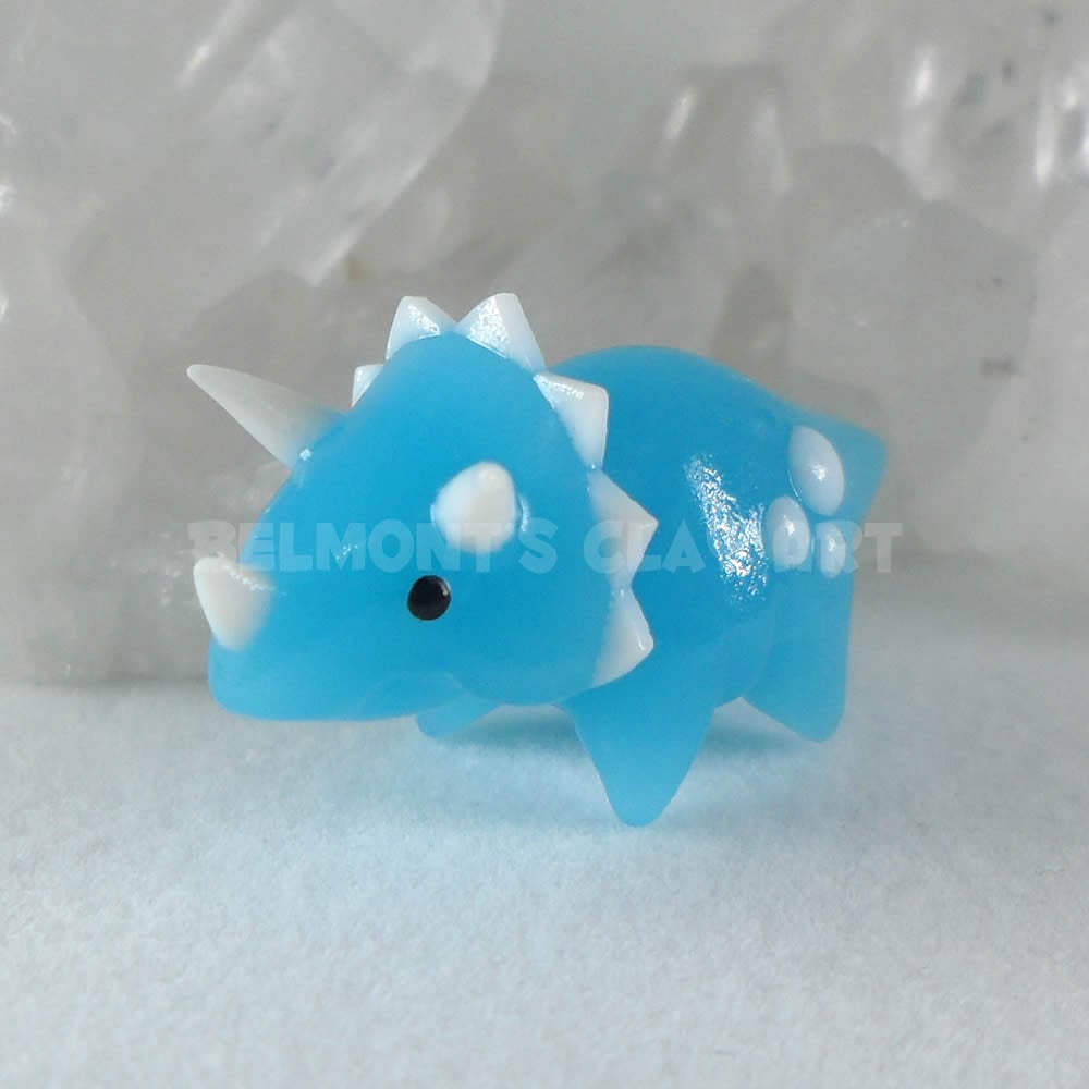 This is a cute mini triceratops made of blue translucent polymer clay. These tiny creatures are the perfect decorative items for small figurine shelves or miniature dioramas๐.